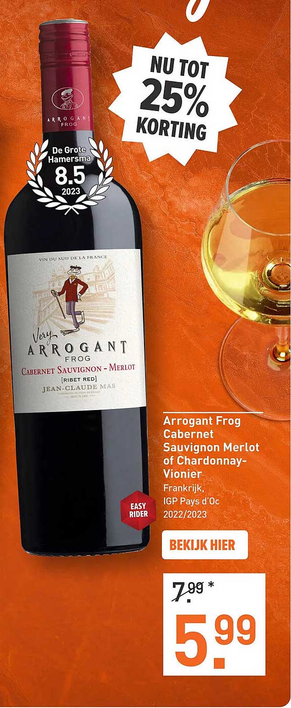 Bekijk nu de Arrogant Frog Cabernet Sauvignon Merlot of Chardonnay-Vionier aanbieding in de Gall & Gall folder. Deze aanbieding is geldig van 17-03-2025 tot en met 23-03-2025.