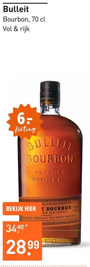 Bekijk nu de Bulleit Bourbon, 70 cl aanbieding in de Gall & Gall folder. Deze aanbieding is geldig van 01-09-2025 tot en met 07-09-2025.