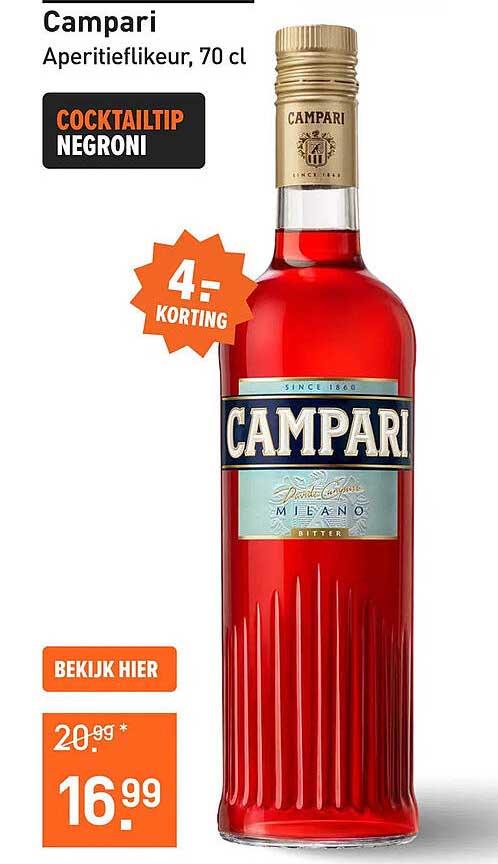 Wil je direct op de hoogte zijn zodra de Campari in de aanbieding is? Meld je aan voor onze aanbiedingen-alert. Zo krijg je een melding zodra het product tegen een voordelige prijs beschikbaar is.