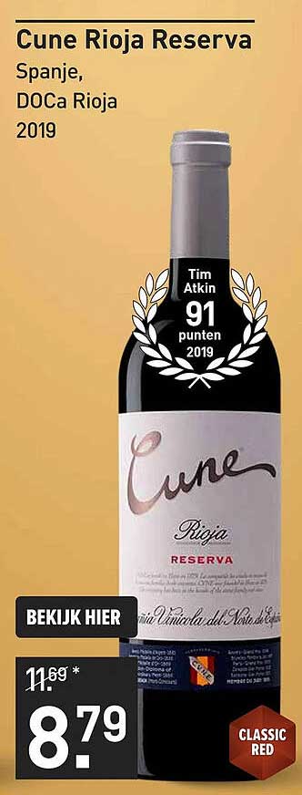 Ontdek de geweldige Cune Rioja Reserva aanbieding in de nieuwste Gall & Gall folder. Naast deze aanbieding vind je nog veel meer aantrekkelijke kortingen. Je kunt de Cune Rioja Reserva eenvoudig online bestellen via de Gall & Gall website of kopen in een winkel bij jou in de buurt.