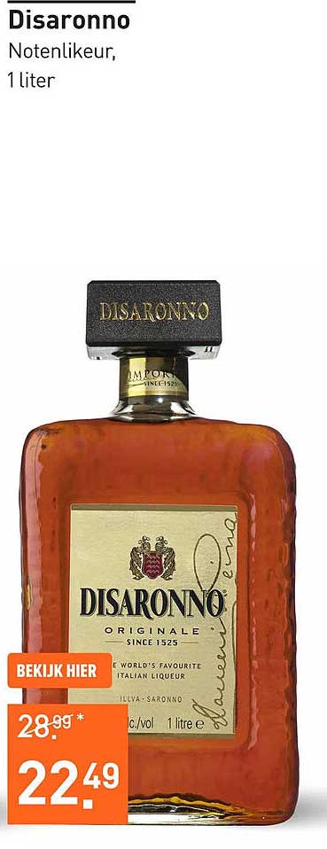 De normale prijs van Disaronno is €28,99, maar tijdens deze actie betaal je slechts €22,49. Dit betekent een stevige besparing van maar liefst €6,50! Een perfecte gelegenheid om deze heerlijke likeur aan je verzameling toe te voegen of om cadeau te geven.