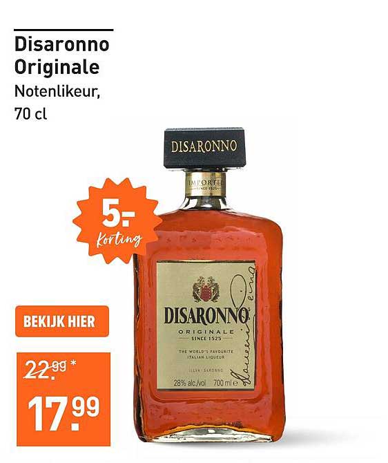 Normaal gesproken kost Disaronno Originale 22,99 euro, maar momenteel krijg je het voor slechts 17,99 euro. Dit betekent een korting van maar liefst 5 euro! Een uitstekende kans om te genieten van een premium likeur zonder je budget te overschrijden.