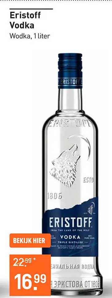 Ontdek de geweldige Eristoff Vodka aanbieding in de nieuwste Gall & Gall folder. Naast deze aanbieding vind je nog veel meer aantrekkelijke kortingen. Je kunt de Eristoff Vodka eenvoudig online bestellen via de Gall & Gall website of kopen in een winkel bij jou in de buurt.
