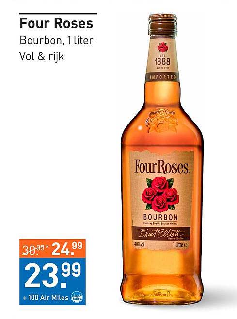 Ben je op zoek naar een heerlijke bourbon om je avonden mee te verrijken? Dan is deze aanbieding van Four Roses precies wat je nodig hebt! Van 16 juni tot 29 juni 2025 kun je deze premium bourbon voordelig aanschaffen. Met zijn rijke en volle smaak is Four Roses een echte aanrader voor zowel de doorgewinterde whisky-liefhebber als de occasional drinker. Dit is jouw kans om te genieten van een klassieke sterrenwaardige bourbon voor een geweldige prijs!