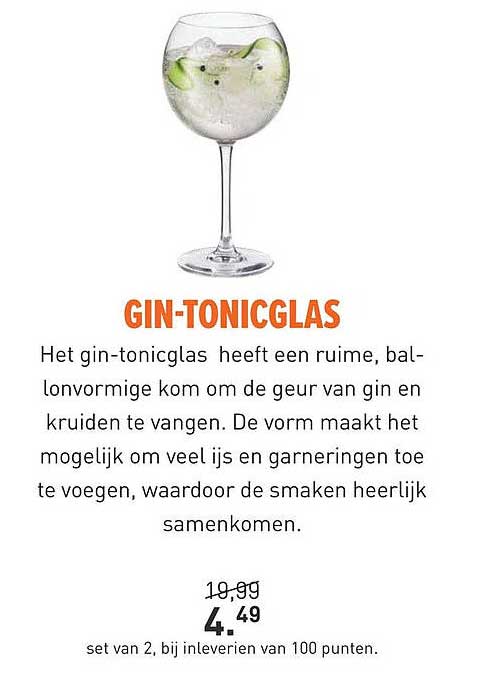 Bekijk de Gin-Tonicglas aanbieding bij Gall & Gall! Deze fantastische aanbieding is nu beschikbaar in de nieuwste Gall & Gall folder. Profiteer van deze kans en bespaar flink op je aankoop.