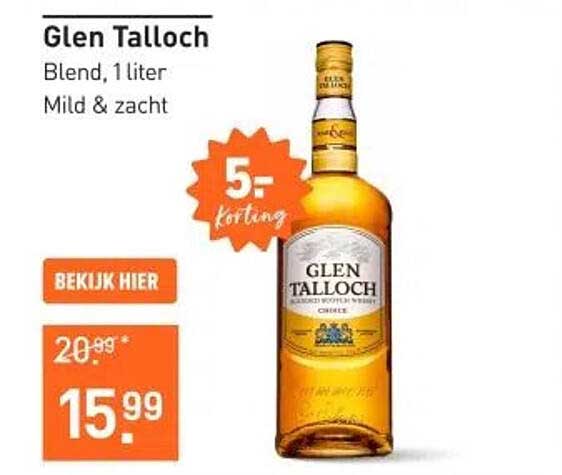 Op zoek naar een heerlijke whisky die perfect is voor elke gelegenheid? Dan is Glen Talloch de ideale keuze voor jou! Met zijn milde en zachte smaak is deze blend een aanwinst voor je drankcollectie. Dit aanbod geeft je de kans om deze kwalitatieve whisky met een mooie korting te genieten. Perfect voor zowel een gezellige avond met vrienden als voor een ontspannen moment voor jezelf.
