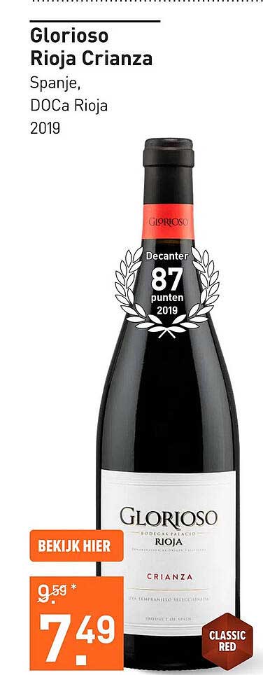 Bekijk de Glorioso Rioja Crianza aanbieding bij Gall & Gall! Deze fantastische aanbieding is nu beschikbaar in de nieuwste Gall & Gall folder. Profiteer van deze kans en bespaar flink op je aankoop.