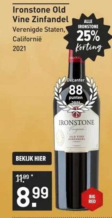 Ben je een liefhebber van wijn? Dan mag je de Ironstone Old Vine Zinfandel niet missen! Deze Californiaanse wijn is perfect voor een gezellig diner, een feest of gewoon om van te genieten op een rustige avond. Met een mooie korting van 25% is dit hét moment om je voorraad aan te vullen!