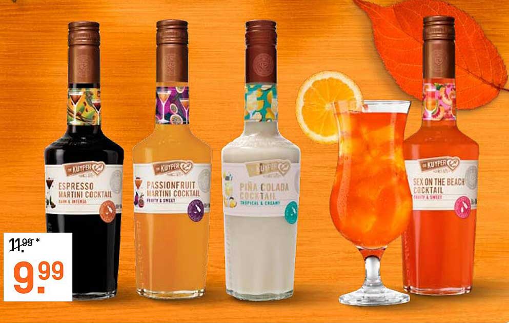 Bekijk de Kuyper Espresso Martini Cocktail Kuyper Passionfruit Martini Cocktail Kuyper Piña Colada Cocktail Kuyper Sex On The Beach Cocktail aanbieding bij Gall & Gall! Deze fantastische aanbieding is nu beschikbaar in de nieuwste Gall & Gall folder. Profiteer van deze kans en bespaar flink op je aankoop.