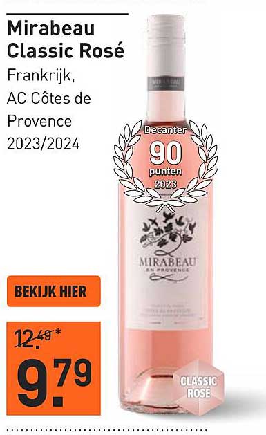 Normaal geprijsd op €12,49, is de Mirabeau Classic Rosé nu verkrijgbaar voor slechts €9,79. Dit betekent een besparing die je niet wilt missen! Een perfecte gelegenheid om nu je voorraad aan te vullen met deze heerlijke rosé.