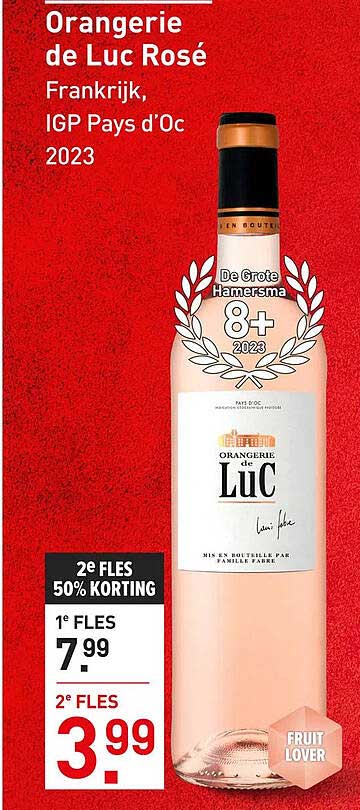 Normaal gesproken betaal je €7,99 voor één fles van de Orangerie de Luc Rosé, maar nu krijg je de tweede fles met maar liefst 50% korting! Hierdoor betaal je slechts €3,99 voor de tweede fles. Dit is een uitstekende kans om deze wijn te proberen en je vrienden te verrassen met een heerlijk en betaalbaar drankje.