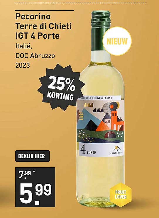 Ben je op zoek naar een heerlijke wijn die perfect past bij zowel een diner als een gezellige borrel? Dan is de Pecorino Terre di Chieti IGT 4 Porte een fantastische keuze! Deze witte wijn uit Italië, afkomstig uit de regio Abruzzo, biedt een unieke smaak en een uitstekende prijs-kwaliteitverhouding. Met een geweldige korting van 25% is dit hét moment om je wijnvoorraad aan te vullen!