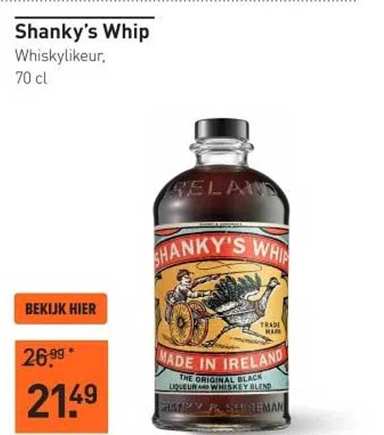 Normaal gesproken wordt Shanky's Whip verkocht voor €26,99, maar deze aanbieding biedt het voor slechts €21,49. Dit betekent dat je maar liefst €5,50 bespaart! Een uitstekende kans om deze premium likeur aan je collectie toe te voegen.