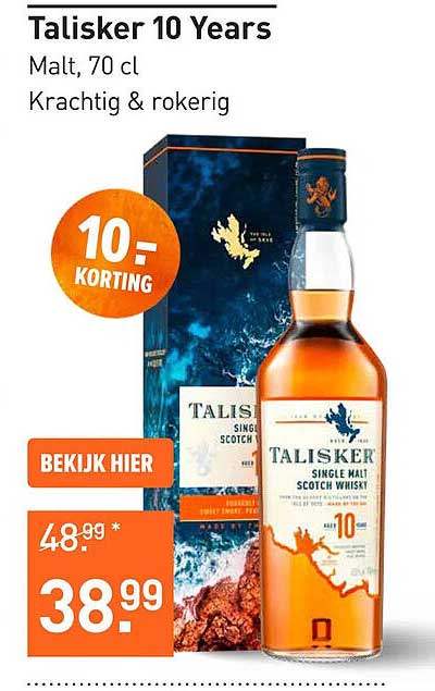 Ontdek de geweldige Talisker 10 Years aanbieding in de nieuwste Gall & Gall folder. Naast deze aanbieding vind je nog veel meer aantrekkelijke kortingen. Je kunt de Talisker 10 Years eenvoudig online bestellen via de Gall & Gall website of kopen in een winkel bij jou in de buurt.