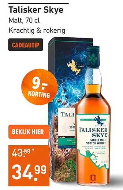 Ontdek de geweldige Talisker Skye aanbieding in de nieuwste Gall & Gall folder. Naast deze aanbieding vind je nog veel meer aantrekkelijke kortingen. Je kunt de Talisker Skye eenvoudig online bestellen via de Gall & Gall website of kopen in een winkel bij jou in de buurt.