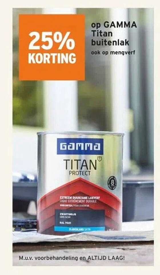 Bekijk nu de 25% KORTING op GAMMA Titan buitenlak aanbieding in de GAMMA folder. Deze aanbieding is geldig van 04-04-2025 tot en met 06-04-2025.