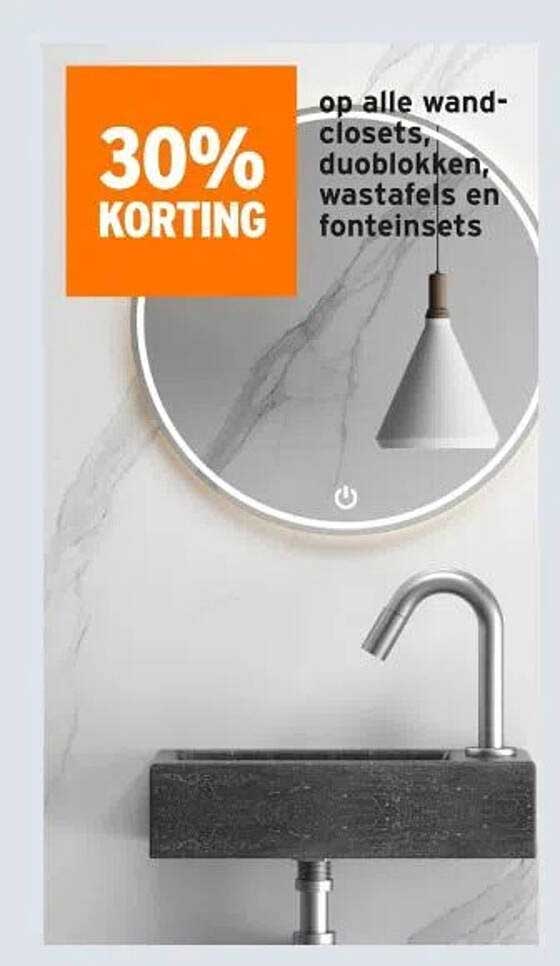 Bekijk nu de 30% KORTING op alle wandclosets, duoblokken, wastafels en fonteinsets aanbieding in de GAMMA folder. Deze aanbieding is geldig van 23-06-2025 tot en met 29-06-2025.