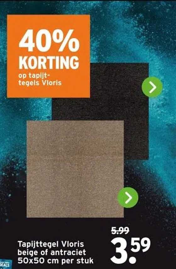 Heb je ooit gedacht aan het veranderen van de uitstraling van je kamer met tapijttegels? Met deze geweldige aanbieding uit de GAMMA-folder kun je nu besparen op tapijttegels Vloris. Deze hoogwaardige tegels zijn niet alleen een visuele aanwinst, maar bieden ook comfort en warmte voor elke ruimte in je huis. Deze aanbieding is perfect voor iedereen die zijn ruimte een frisse uitstraling wil geven zonder de bank te breken. En dat met een korting van 40%!