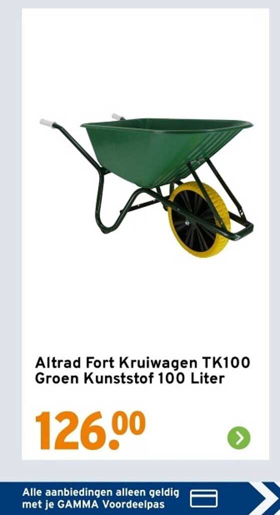 Bekijk de Altrad Fort Kruiwagen Tk100 Groen Kunststof 100 Liter aanbieding bij GAMMA! Deze fantastische aanbieding is nu beschikbaar in de nieuwste GAMMA folder. Profiteer van deze kans en bespaar flink op je aankoop.