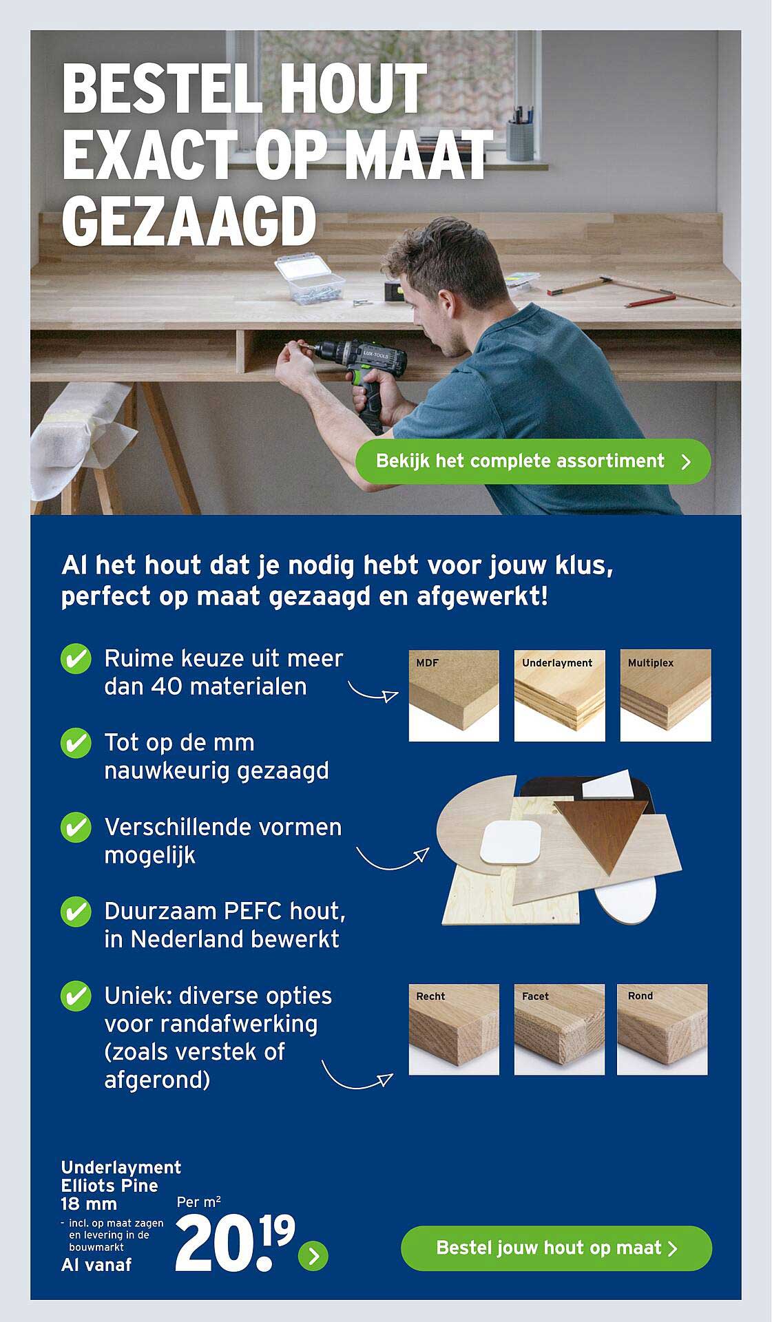 Droom jij van een perfect op maat gemaakt meubelstuk of een fraaie kluskachel? Kijk dan niet verder! Bij GAMMA kun je nu hout exact op maat laten zagen. Deze aanbieding biedt je de kans om al het hout dat je nodig hebt, perfect op maat gezaagd en afgewerkt te bestellen. Dit is de ideale oplossing voor iedere doe-het-zelver en meubelliefhebber. Met een ruime keuze uit meer dan 40 materialen weet je zeker dat je altijd het juiste hout vindt voor jouw project.