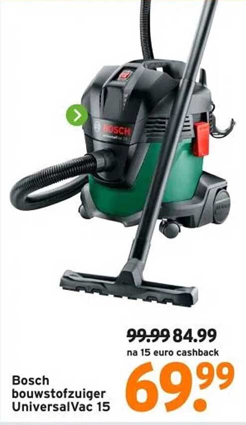 Ben je op zoek naar een krachtige en veelzijdige stofzuiger voor jouw klussen? De Bosch bouwstofzuiger UniversalVac 15 is nu in de aanbieding! Met een royale korting van 30 euro en een extra cashback van 15 euro is dit hét moment om deze onmisbare tool aan te schaffen. Dit apparaat is perfect voor zowel professionals als doe-het-zelvers en zorgt ervoor dat je altijd een schone werkplek hebt.