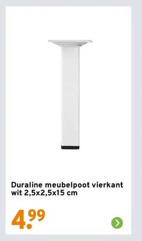Bekijk nu de Duraline meubelpoten vierkant wit 2,5x2,5x15 cm aanbieding in de GAMMA folder. Deze aanbieding is geldig van 06-10-2025 tot en met 12-10-2025.