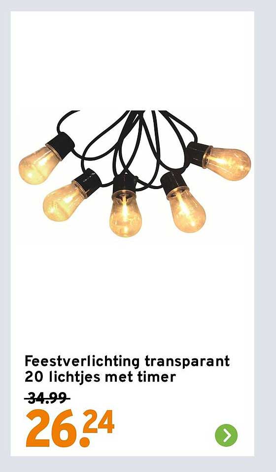 Bekijk nu de Feestverlichting transparant 20 lichtjes met timer aanbieding in de GAMMA folder. Deze aanbieding is geldig van 09-05-2025 tot en met 11-05-2025.