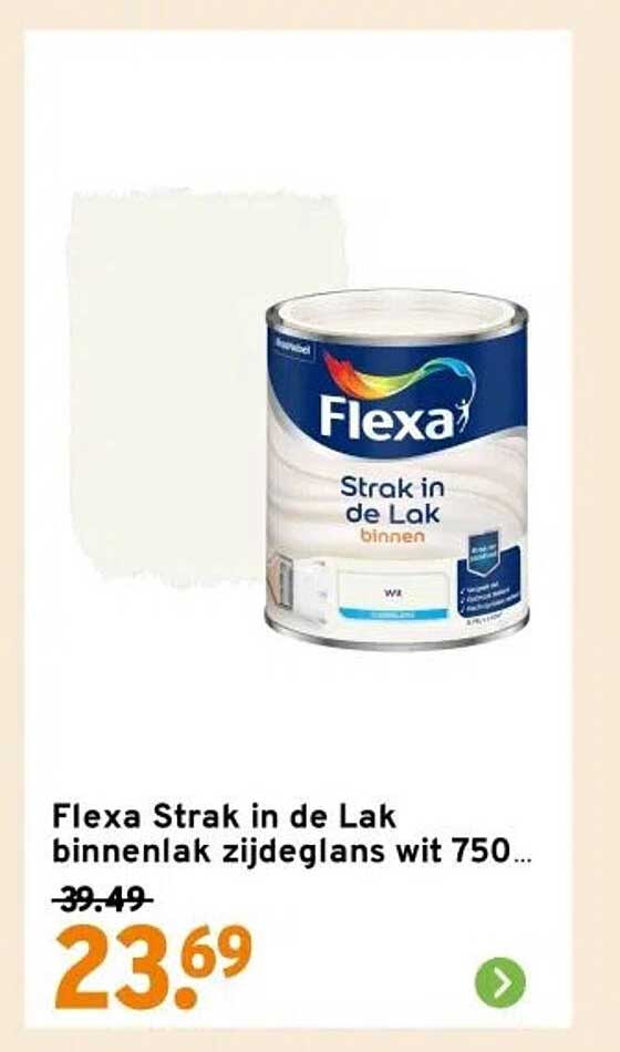 Bekijk nu de Flexa Strak in de Lak binnenlak zijdeglans wit 750 ml aanbieding in de GAMMA folder. Deze aanbieding is geldig van 16-05-2025 tot en met 18-05-2025.