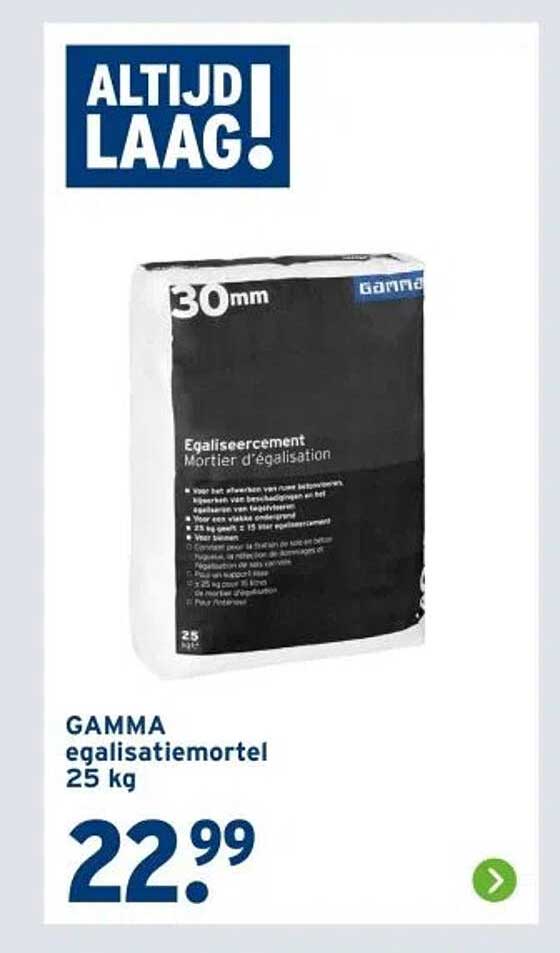 Voor slechts €22,99 is deze GAMMA egalisatiemortel een echte koopje, gezien de normale prijs vaak hoger ligt. Dit biedt je niet alleen een kwalitatief hoogstaand product, maar ook een aanzienlijke besparing. Met deze aanbieding haal je de beste prijs-kwaliteitverhouding in huis!