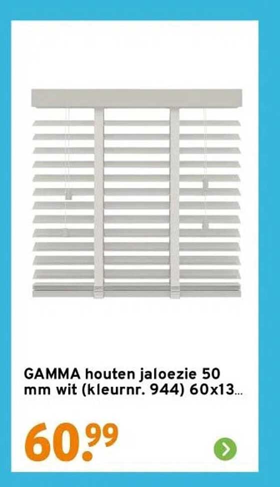 Bekijk nu de GAMMA houten jaloezie 50 mm wit (kleurnr. 944) 60x13... aanbieding in de GAMMA folder. Deze aanbieding is geldig van 01-09-2025 tot en met 07-09-2025.