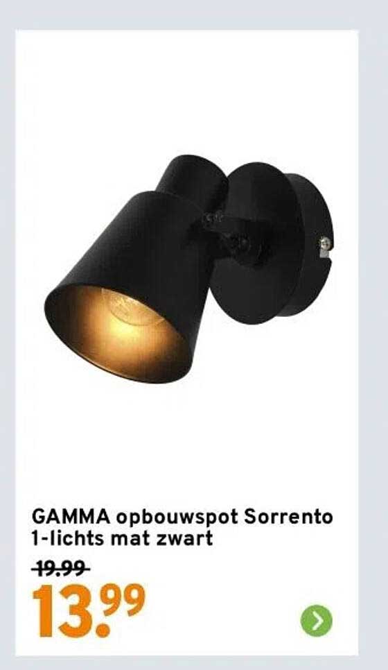 Bekijk nu de GAMMA opbouwspot Sorrento 1-lichts mat zwart aanbieding in de GAMMA folder. Deze aanbieding is geldig van 19-05-2025 tot en met 25-05-2025.