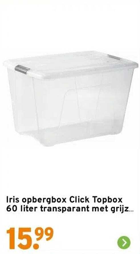 Ben jij op zoek naar een handige en ruime opbergoplossing voor al jouw spullen? Zoek niet verder! Hier vind je een geweldige aanbieding voor de Iris opbergbox Click Topbox van 60 liter. Deze box is perfect voor het organiseren van alles van seizoenskleding tot knutselspullen. Met deze aanbieding kun je nu op een slimme manier ruimte besparen in je huis!