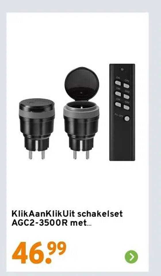 Bekijk nu de KlikAanKlikUit schakelset AGC2-3500R met... aanbieding in de GAMMA folder. Deze aanbieding is geldig van 06-10-2025 tot en met 12-10-2025.