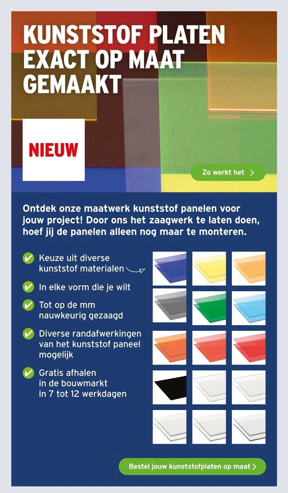 Heb jij een project in gedachten waarvoor je op zoek bent naar maatwerk kunststof panelen? Dan is dit dé aanbieding voor jou! Bij GAMMA bied je op een eenvoudige manier kunststof platen aan die exact op jouw wensen zijn afgestemd. Of je nu een doe-het-zelf project hebt of professioneel bezig bent, deze panelen zijn perfect voor elke klus.
