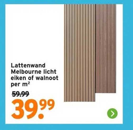 Bekijk nu de Lattenwand Melbourne licht eiken of walnoot per m² aanbieding in de GAMMA folder. Deze aanbieding is geldig van 24-03-2025 tot en met 30-03-2025.