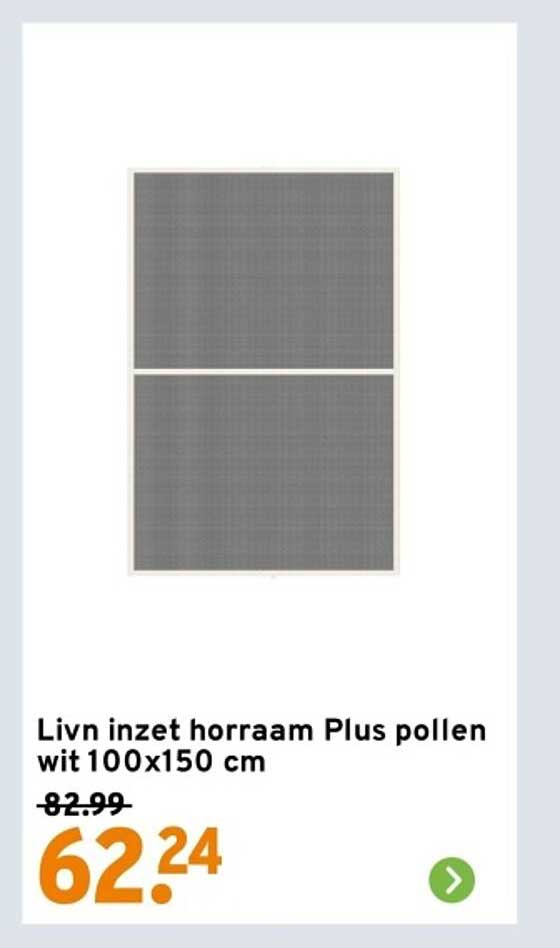 Bekijk nu de Livn inzet horraam Plus pollen wit 100x150 cm aanbieding in de GAMMA folder. Deze aanbieding is geldig van 14-04-2025 tot en met 20-04-2025.