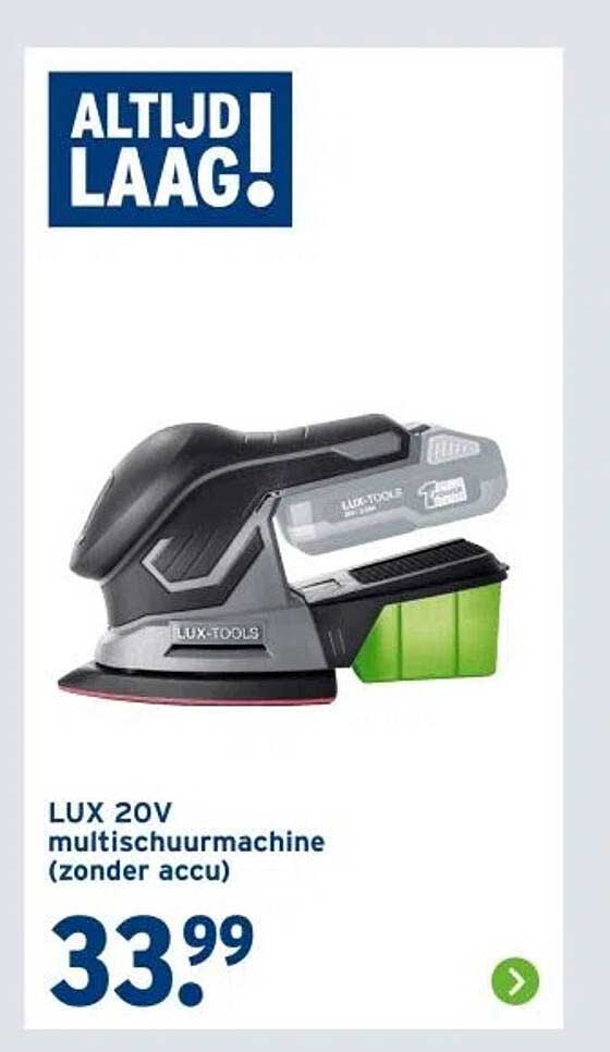 Bekijk de Lux 20V Multischuurmachine (Zonder Accu) aanbieding bij GAMMA! Deze fantastische aanbieding is nu beschikbaar in de nieuwste GAMMA folder. Profiteer van deze kans en bespaar flink op je aankoop.