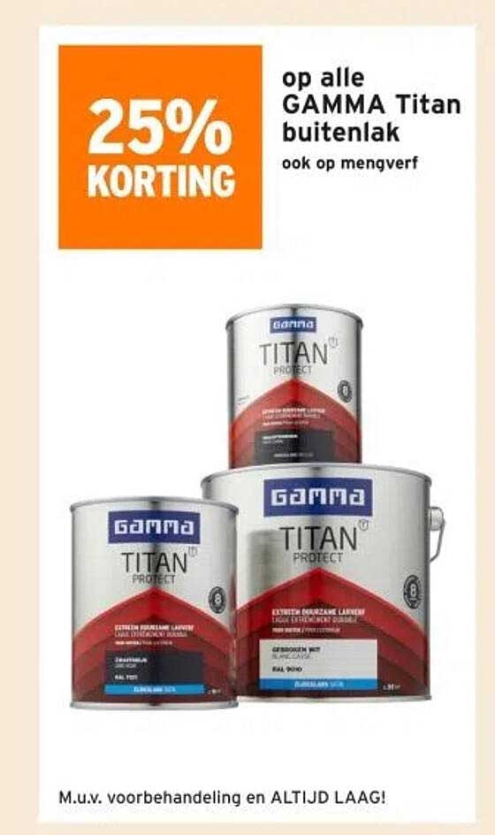 Ben je op zoek naar een betrouwbare en kwalitatieve buitenlak voor je volgende klus? Dan moet je deze aanbieding echt niet missen! Bij GAMMA krijg je maar liefst 25% korting op alle GAMMA Titan buitenlak, inclusief mengverf. Dit is het perfecte moment om je huis een frisse uitstraling te geven en je buitenprojecten naar een hoger niveau te tillen.