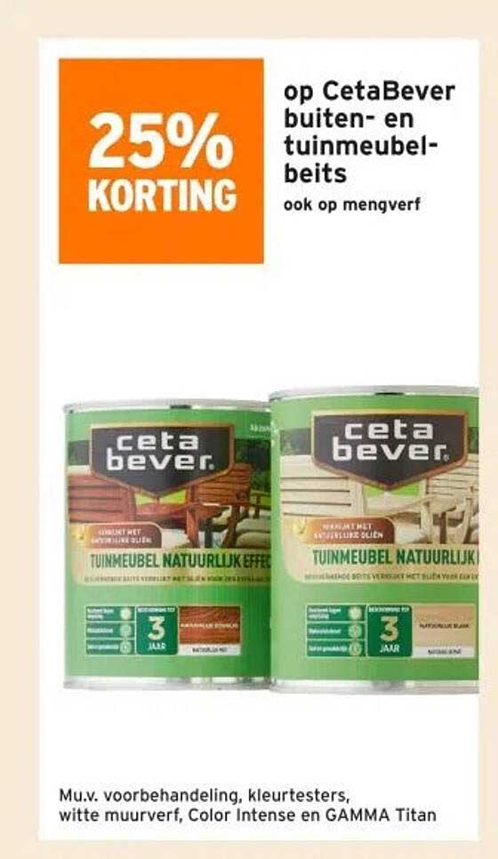 Bekijk nu de op CetaBeaver buiten- en tuinmeubelbeits ook op mengverf aanbieding in de GAMMA folder. Deze aanbieding is geldig van 19-05-2025 tot en met 25-05-2025.
