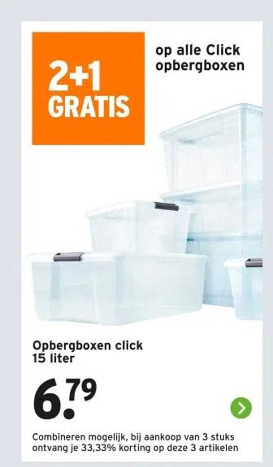 Ben je op zoek naar een handige manier om je spullen op te bergen? Dan is deze aanbieding van GAMMA perfect voor jou! De opbergboxen zijn ideaal voor het ordenen van je huis, garage of tuin en deze week krijg je zelfs een prachtige actie: 2+1 gratis op alle Click opbergboxen. Dit is de kans om je opslagmogelijkheden uit te breiden zonder dat je de hoofdprijs betaalt.