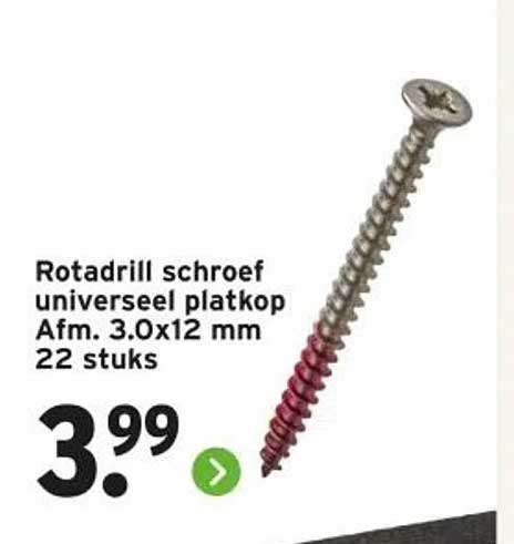 Bekijk nu de Rotadrill schroef universeel platkop Afm. 3.0x12 mm 22 stuks aanbieding in de GAMMA folder. Deze aanbieding is geldig van 21-03-2025 tot en met 23-03-2025.