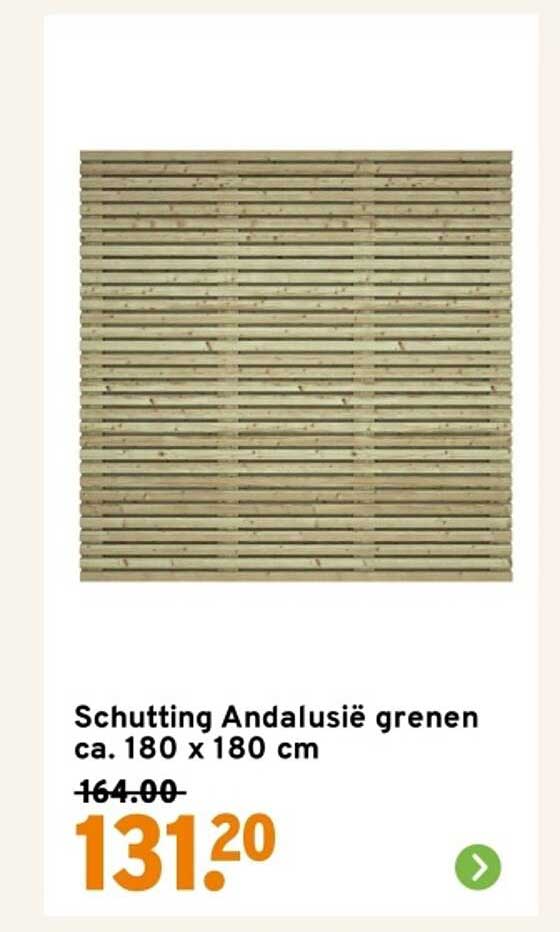 Ontdek de geweldige Schutting Andalusië Greenen aanbieding in de nieuwste GAMMA folder. Naast deze aanbieding vind je nog veel meer aantrekkelijke kortingen. Je kunt de Schutting Andalusië Greenen eenvoudig online bestellen via de GAMMA website of kopen in een winkel bij jou in de buurt.