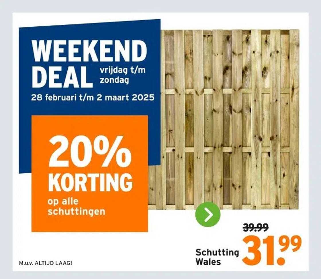 Bekijk nu de Schutting Wales aanbieding in de GAMMA folder. Deze aanbieding is geldig van 28-02-2025 tot en met 02-03-2025.