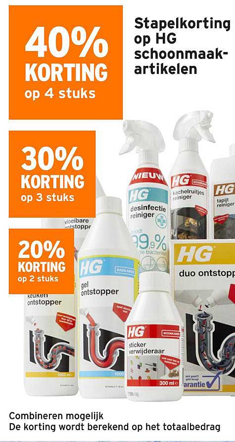 Bij de aankoop van HG schoonmaakartikelen profiteer je van geweldige kortingen, waaronder 40% korting op de aankoop van 4 stuks, 30% op 3 stuks en 20% op 2 stuks! Dit betekent dat je niet alleen de beste producten in huis haalt, maar ook nog eens flink bespaart. Dit is een kans die je niet wilt missen!
