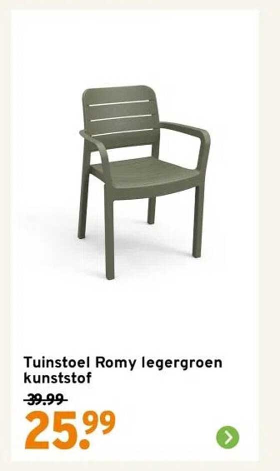 Bekijk nu de Tuinstoel Romy legergroen kunststof aanbieding in de GAMMA folder. Deze aanbieding is geldig van 21-07-2025 tot en met 27-07-2025.