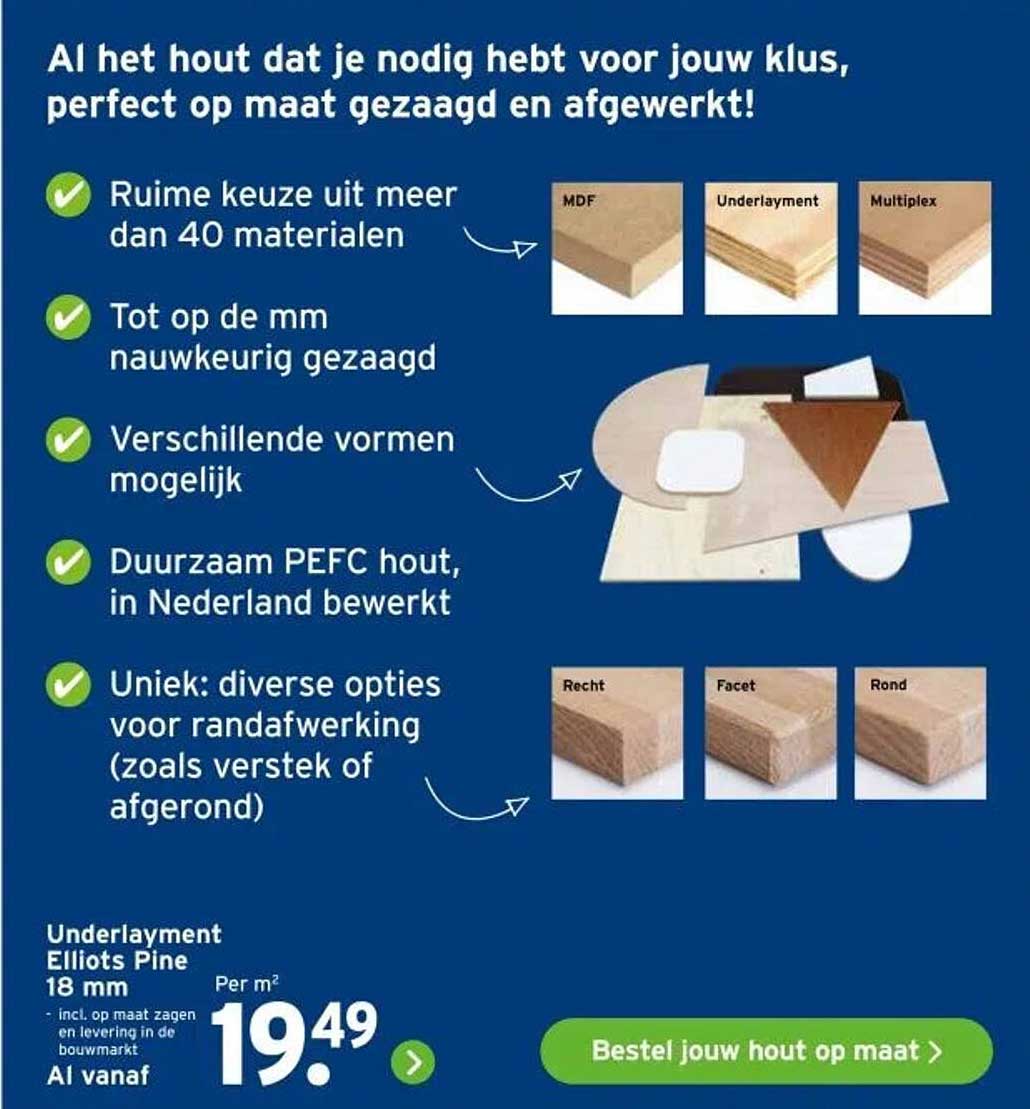 Ben je op zoek naar de perfecte basis voor jouw klussen? Dan is de aanbieding van Underlayment Elliots Pine 18 mm iets voor jou! Deze aanbieding is ideaal voor zowel de doe-het-zelver als de professional. Met een ruime keuze uit meer dan 40 materialen, ben je verzekerd van de beste kwaliteit hout, perfect op maat gezaagd en afgewerkt. Deze aanbieding is geldig van 24 oktober 2025 tot en met 26 oktober 2025.