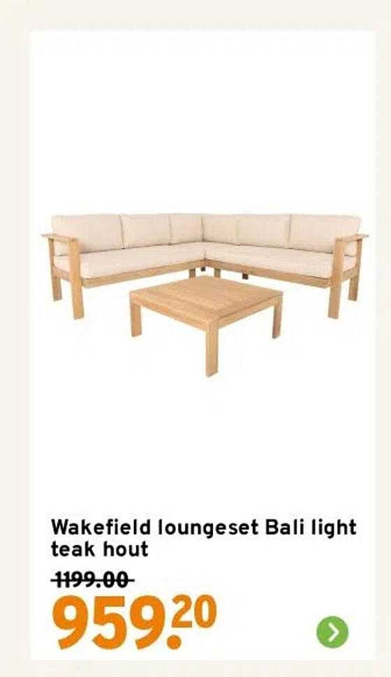 Ben je op zoek naar de perfecte loungeset om ontspannen te genieten van je tuin of terras? Zoek niet verder! Op deze pagina vind je de prachtige Wakefield loungeset Bali van licht teak hout. Deze set is niet alleen een aanwinst voor je buitenruimte, maar ook een fantastisch aanbod dat je niet wilt missen. Met een korting van maar liefst €239,80 is dit de kans om jouw buitenleven naar een hoger niveau te tillen!