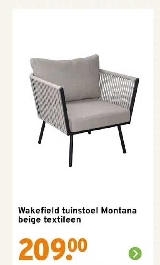 Bekijk nu de Wakefield tuinstoel Montana beige textileen aanbieding in de GAMMA folder. Deze aanbieding is geldig van 19-05-2025 tot en met 25-05-2025.