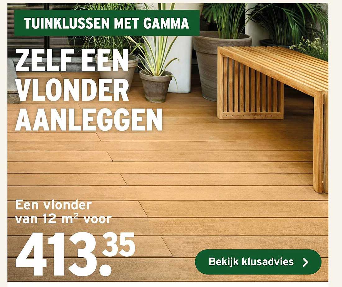 Bekijk nu de Zelf een vlonder aanleggen aanbieding in de GAMMA folder. Deze aanbieding is geldig van 22-04-2025 tot en met 23-04-2025.
