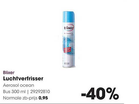 De Blixer luchtverfrisser is een aerosol met een heerlijke oceaangeur. Het product is speciaal ontworpen om snel en effectief te werken, waardoor ongewenste geuren direct worden geneutraliseerd. Met slechts een paar sprays geniet je van een langdurige frisheid. De gebruiksvriendelijke verpakking maakt het eenvoudig om het product in gebruik te nemen. Ideaal voor thuis, op kantoor of in je auto!